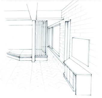 動線を妨げたくないことと、階段を上がった廊下からの繋がりをもたせたかったので、スケッチのような形状を考えました。