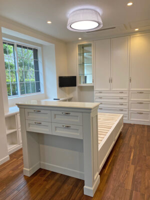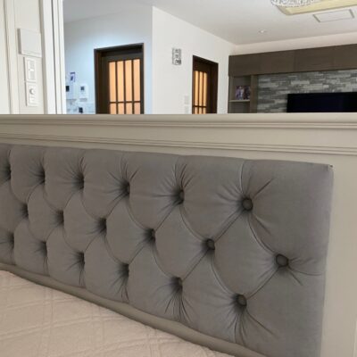 ベッドのヘッド、空間を仕切る目隠し、そして収納を兼ねたヘッドボード。 どちらの面も見せたくなるようなデザインです。 リビングから見える小引出しカウンターの裏面が、ボタン締めされたヘッドボードになっています。