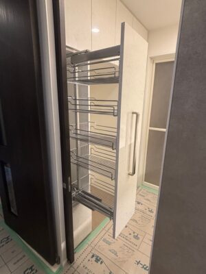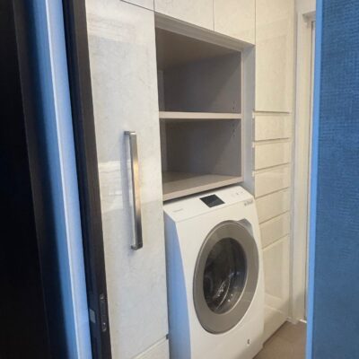 廊下からと脱衣室側から両面から出し入れできるスライド収納。