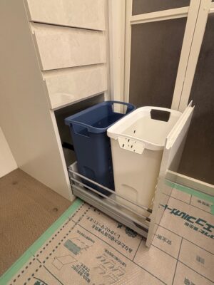 浴室側には洗濯物をスマートに隠せるバスケット。